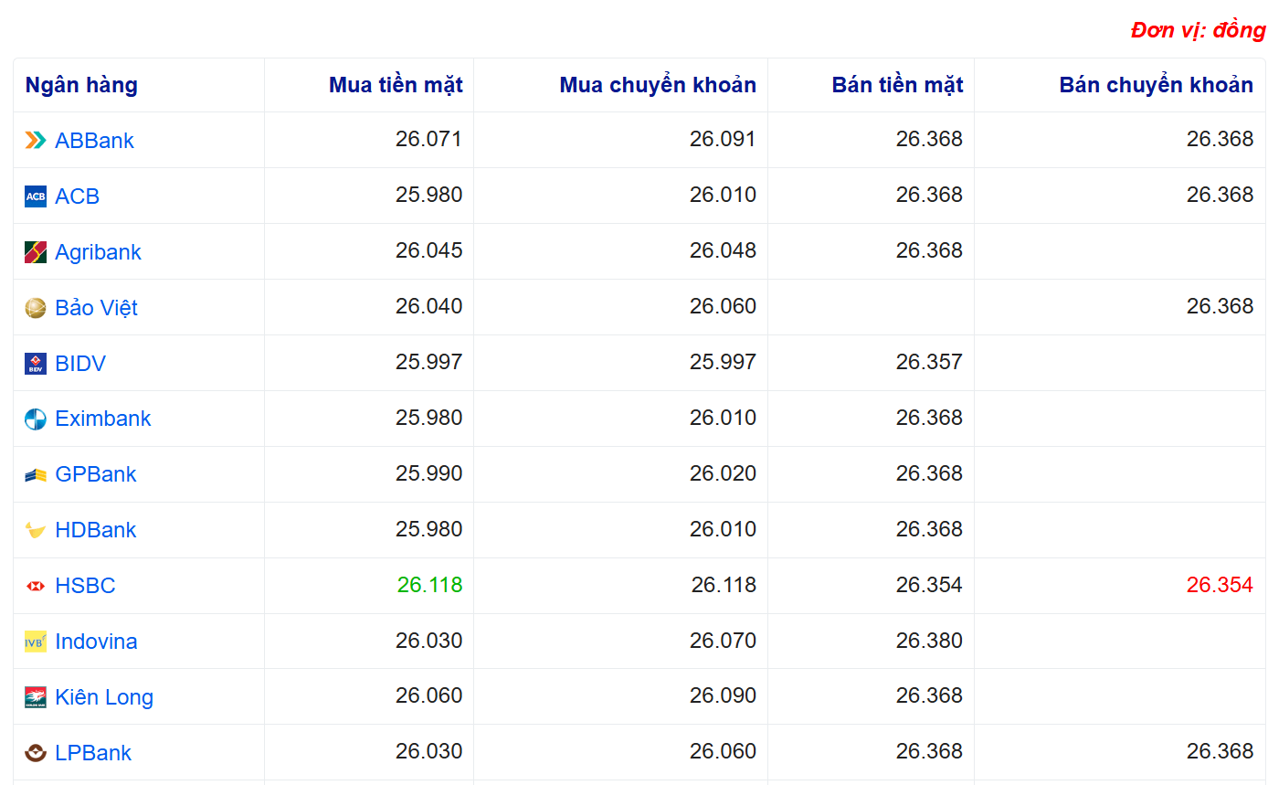 Tại thị trường trong nước, cùng với việc tỷ giá trung tâm giảm, tỷ giá USD tại Sở giao dịch Ngân hàng Nhà nước được điều chỉnh tăng ở chiều mua – bán, hiện niêm yết ở mức 23.908 – 26.318 đồng/USD. Tại các ngân hàng thương mại lớn, giá USD nhìn chung giảm so với phiên trước, với mức mua vào phổ biến quanh 25.800 – 26.000 đồng/USD và bán ra dao động từ 26.357 – 26.368 đồng/USD.
