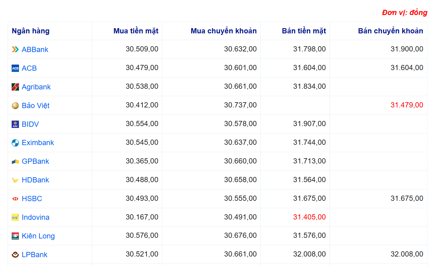 Tỷ giá USD tại một số ngân hàng: