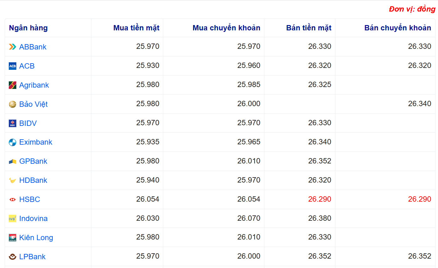 Tại Sở giao dịch Ngân hàng Nhà nước, tỷ giá USD được niêm yết ở mức 23.894 đồng/USD ở chiều mua vào và 26.302 đồng/USD ở chiều bán ra. Tại các ngân hàng thương mại lớn, tỷ giá USD đồng loạt giảm, với Vietcombank giao dịch quanh mức 25.940 – 26.330 đồng/USD, VietinBank ở mức 25.765 – 26.305 đồng/USD và BIDV mua vào 25.970 đồng/USD, bán ra 26.330 đồng/USD.