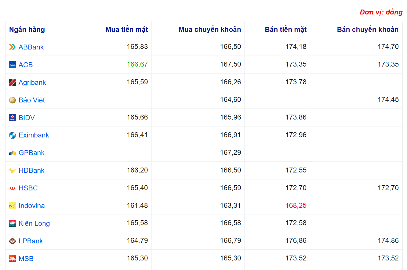 Tỷ giá yên Nhật tại một số ngân hàng: