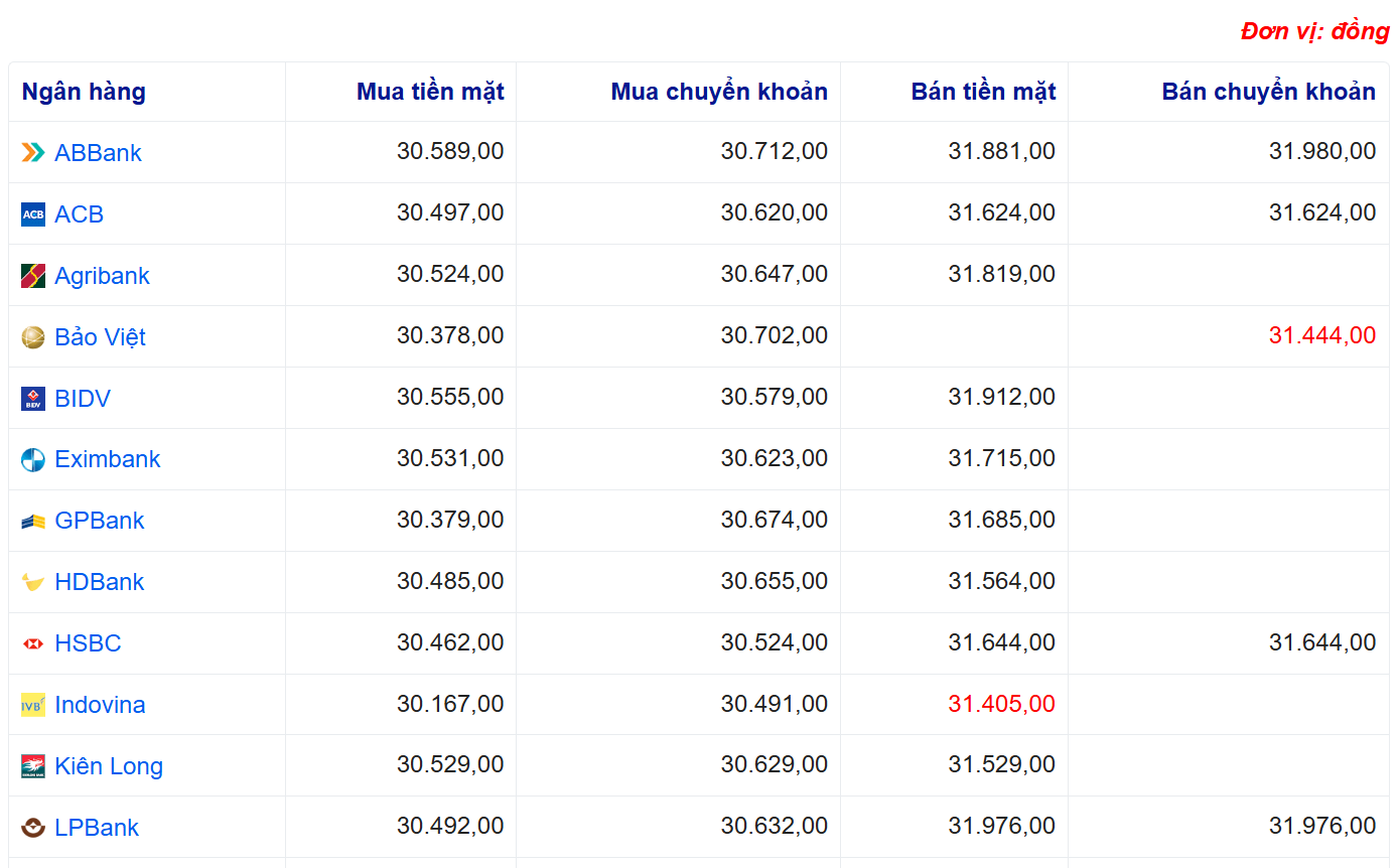 Tỷ giá USD tại một số ngân hàng: