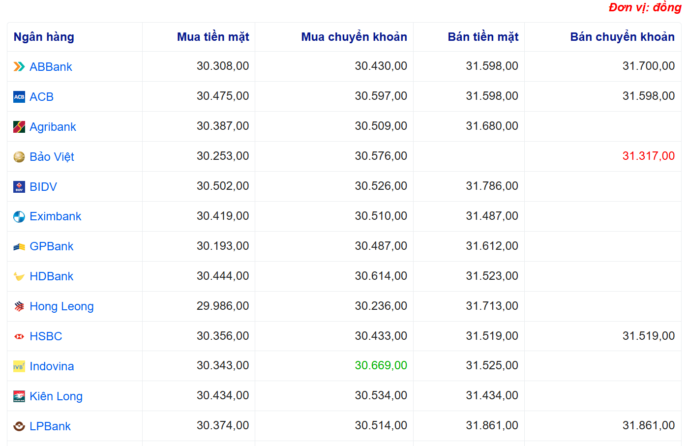 Đối với các ngoại tệ khác, tỷ giá EUR tại Sở giao dịch Ngân hàng Nhà nước giữ nguyên ở mức 28.129 đồng mua vào và 31.090 đồng bán ra. Tại các ngân hàng thương mại, Vietcombank niêm yết 30.166 – 31.757 đồng/EUR, VietinBank giao dịch 30.130 – 31.850 đồng/EUR, trong khi BIDV ở mức 30.502 – 31.786 đồng/EUR.