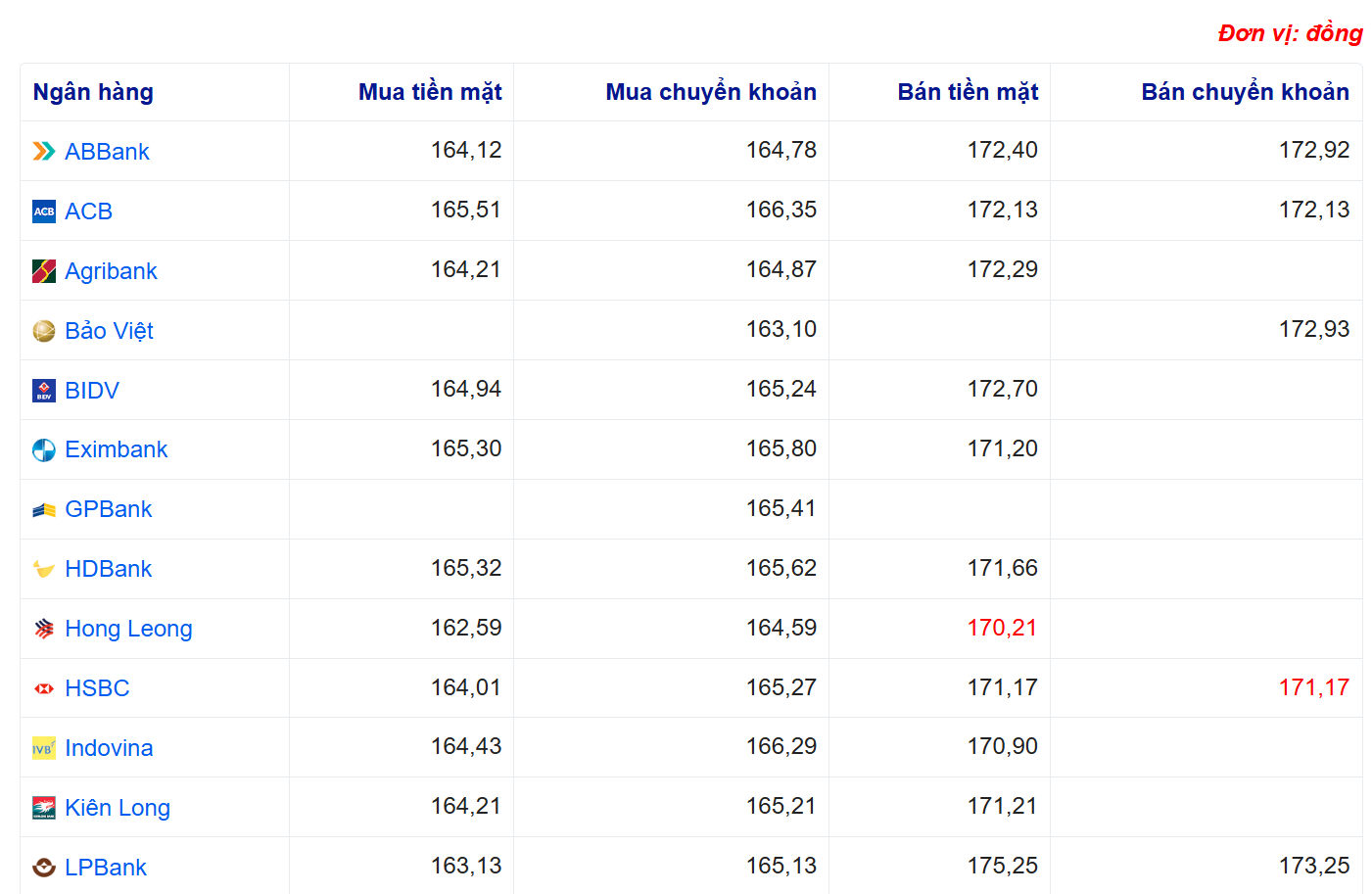 Tỷ giá yên Nhật tại Sở giao dịch Ngân hàng Nhà nước cũng đi ngang, ở mức 153 đồng mua vào và 169 đồng bán ra. Tại các ngân hàng thương mại, Vietcombank niêm yết 162,06 – 172,35 đồng/JPY, VietinBank giao dịch 162,57 – 174,07 đồng/JPY và BIDV ở mức 164,94 – 172,70 đồng/JPY.