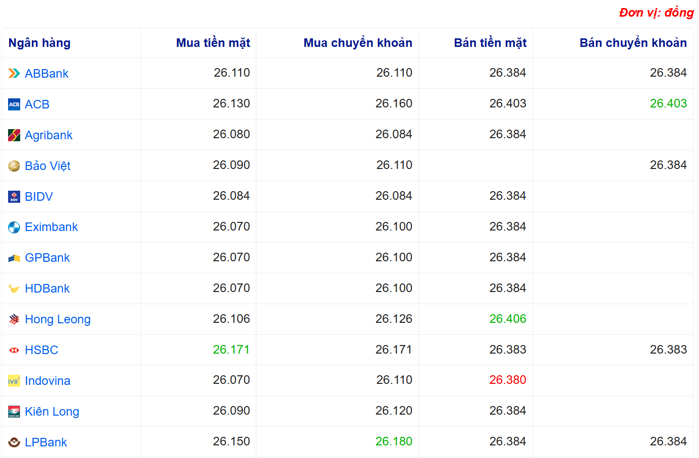 Ở thị trường trong nước, Ngân hàng Nhà nước công bố tỷ giá trung tâm của đồng Việt Nam với USD tiếp tục được giữ nguyên ở mức 25.128 đồng/USD. Tỷ giá USD tại Sở giao dịch Ngân hàng Nhà nước tiếp tục được giữ nguyên ở mức 23.922 đồng mua vào và 26.334 đồng bán ra. Tại các ngân hàng thương mại, tỷ giá USD nhìn chung ổn định khi Vietcombank niêm yết ở mức 26.054 – 26.384 đồng/USD, VietinBank giao dịch quanh 25.923 – 26.384 đồng/USD và BIDV ở mức 26.084 – 26.384 đồng/USD.