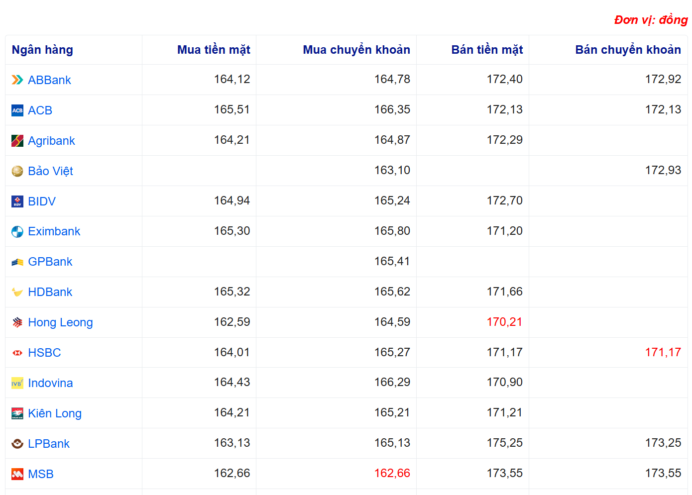 Tỷ giá yên Nhật tại Sở giao dịch Ngân hàng Nhà nước cũng đi ngang, ở mức 153 đồng mua vào và 169 đồng bán ra. Tại các ngân hàng thương mại, Vietcombank niêm yết 162,06 – 172,35 đồng/JPY, VietinBank giao dịch 162,57 – 174,07 đồng/JPY và BIDV ở mức 164,94 – 172,70 đồng/JPY.