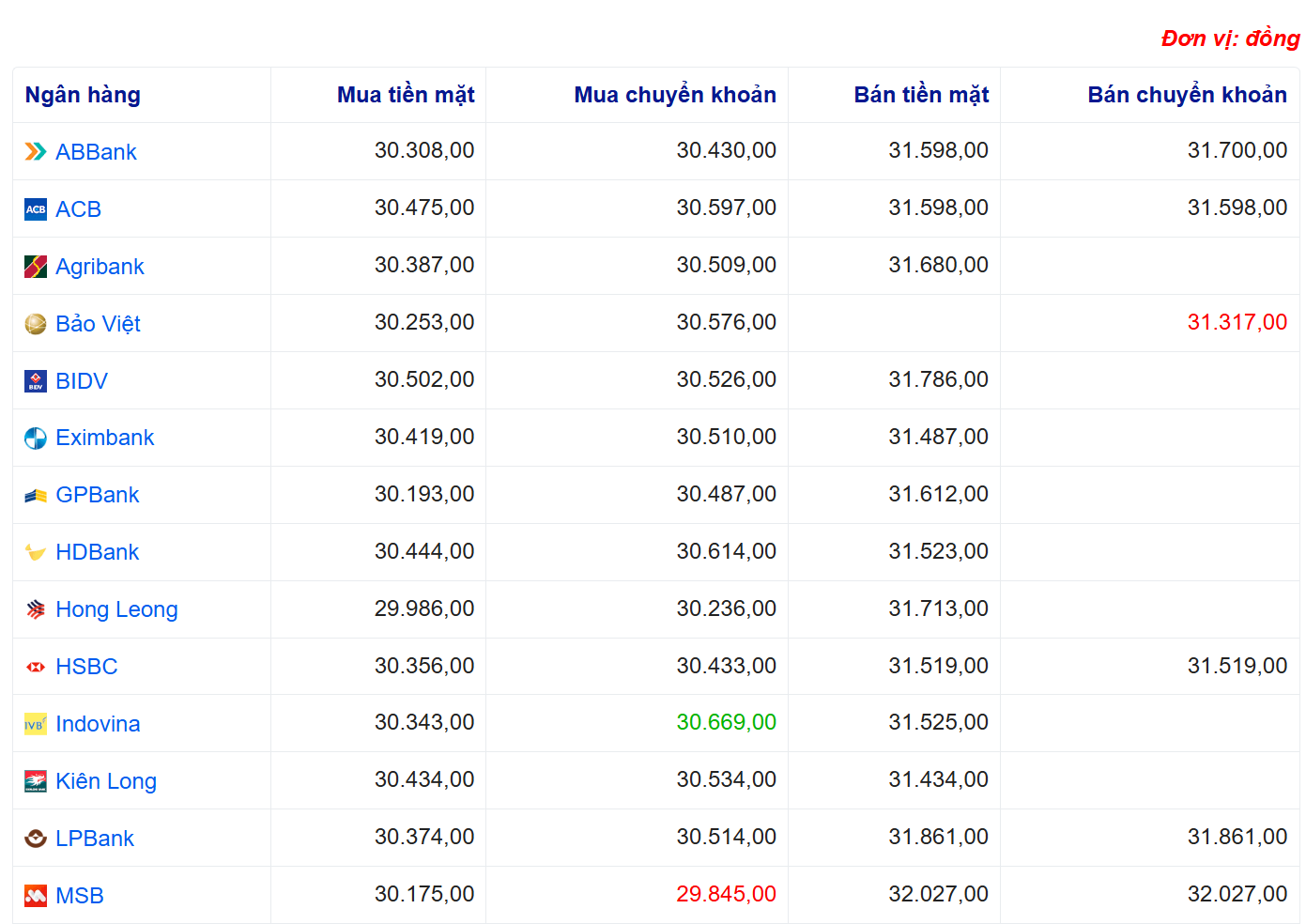 Đối với các ngoại tệ khác, tỷ giá EUR tại Sở giao dịch Ngân hàng Nhà nước giữ nguyên ở mức 28.129 đồng mua vào và 31.090 đồng bán ra. Tại các ngân hàng thương mại, Vietcombank niêm yết 30.166 – 31.757 đồng/EUR, VietinBank giao dịch 30.130 – 31.850 đồng/EUR, trong khi BIDV ở mức 30.502 – 31.786 đồng/EUR.