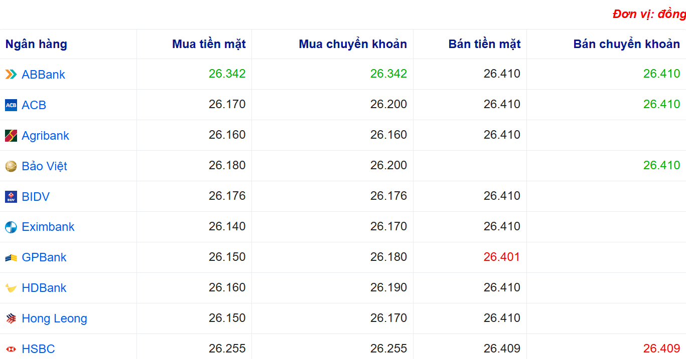 Vietcombank giao dịch USD ở mức 26.140 – 26.410 đồng; VietinBank ở mức 26.124 – 26.410 đồng; BIDV ở mức 26.176 – 26.410 đồng; Techcombank ở mức 26.112 – 26.410 đồng; Eximbank ở mức 26.140 – 26.410 đồng; Sacombank ở mức 25.902 – 26.405 đồng.
