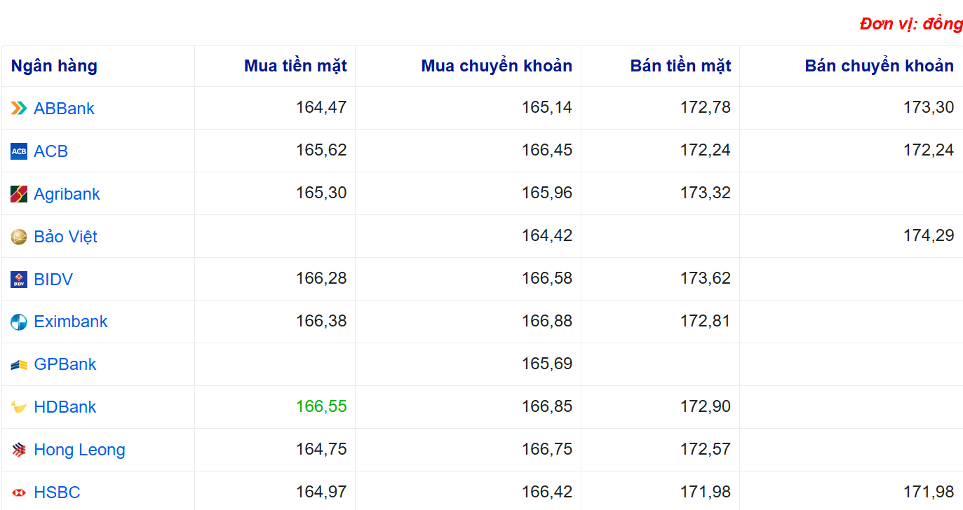 Tỷ giá Yên Nhật tại một số ngân hàng: