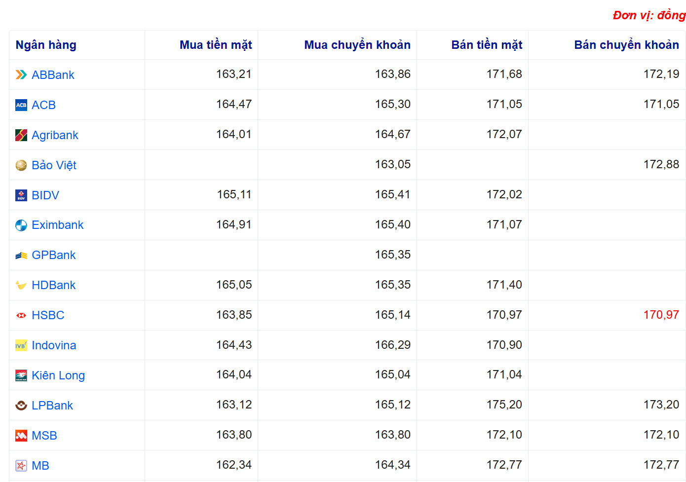 Tỷ giá yên Nhật tại một số ngân hàng: