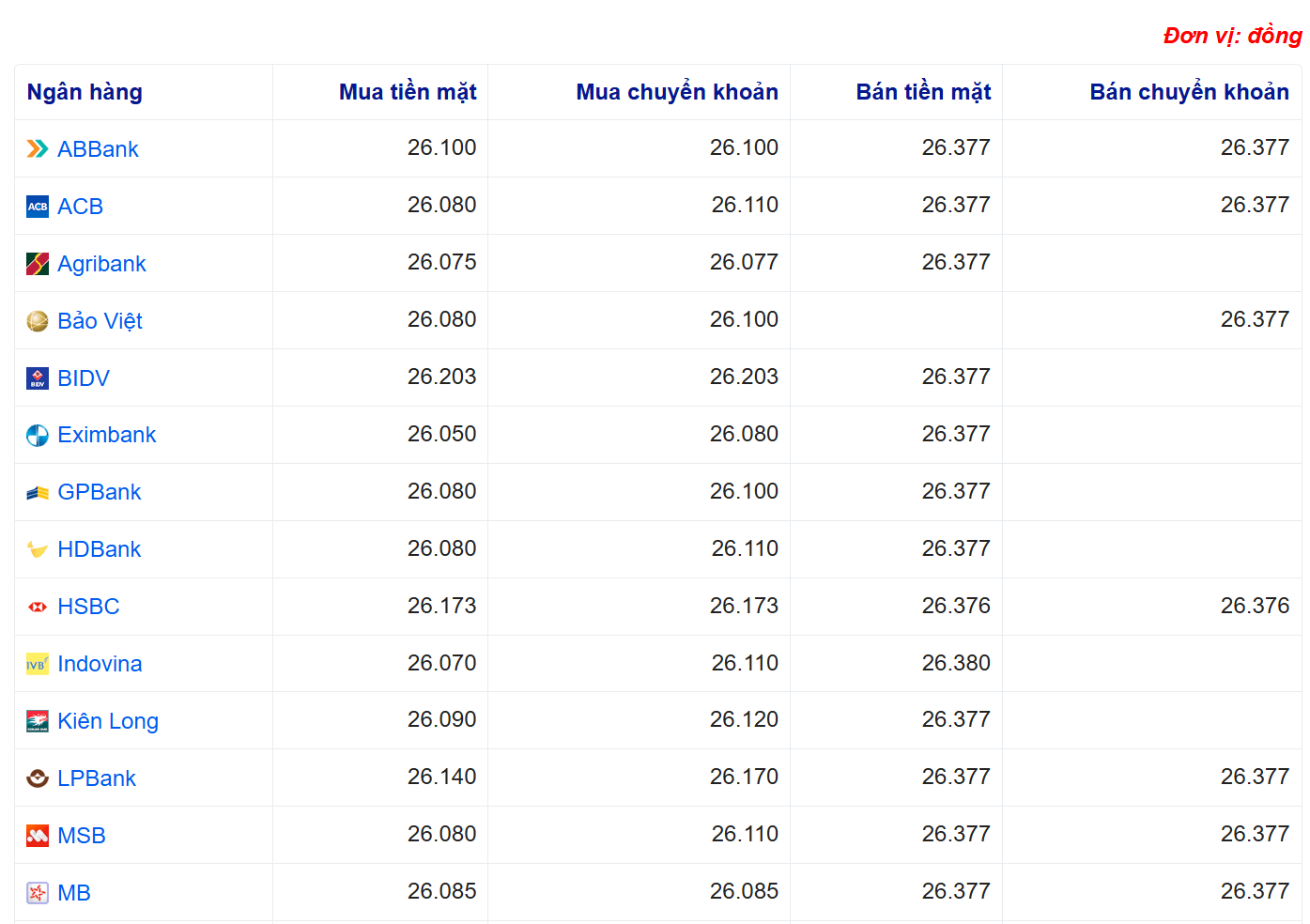 Tỷ giá USD tại một số ngân hàng: