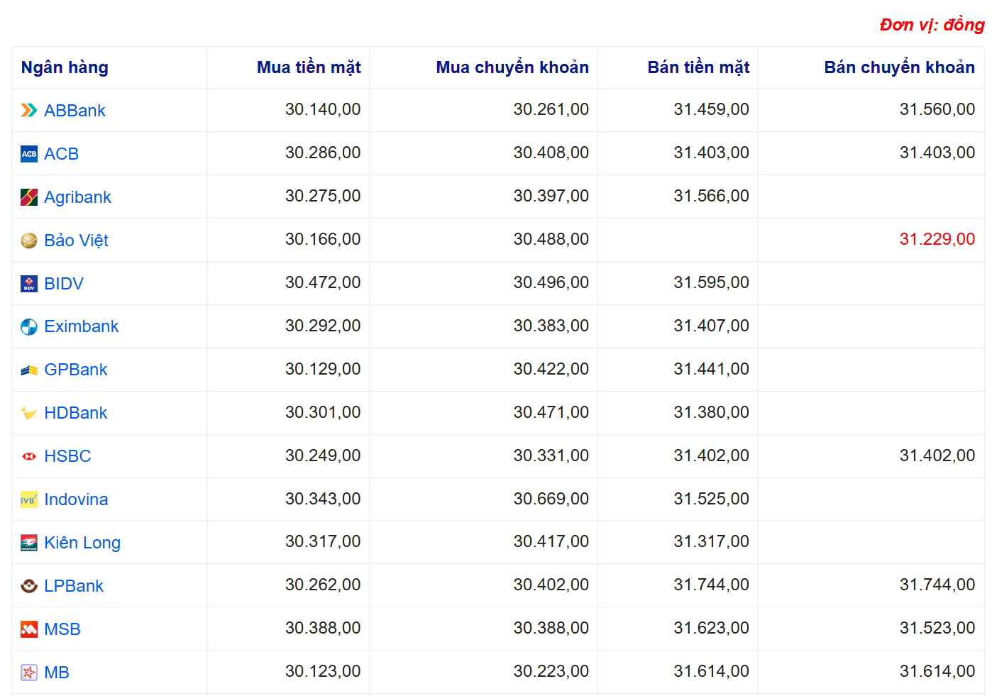 Đối với các ngoại tệ khác, tỷ giá EUR tại Sở giao dịch Ngân hàng Nhà nước hiện ở mức 28.035 đồng mua vào và 30.986 đồng bán ra. Tại các ngân hàng thương mại, Vietcombank niêm yết 30.045 – 31.653 đồng/EUR, VietinBank giao dịch 29.917 – 31.637 đồng/EUR và BIDV ở mức 30.472 – 31.595 đồng/EUR.