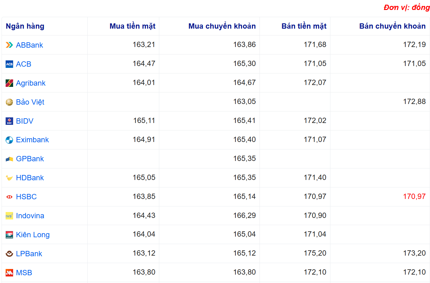 Tỷ giá yên Nhật tại một số ngân hàng: