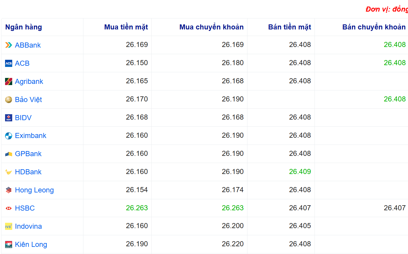 Tại các ngân hàng thương mại, giá USD giữ ổn định: Vietcombank giao dịch ở mức 26.138 - 26.408 đồng, VietinBank niêm yết 26.000 - 26.408 đồng, còn BIDV ghi nhận 26.168 - 26.408 đồng/USD.