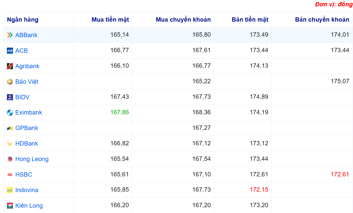 Tỷ giá yên Nhật tại Sở giao dịch giữ nguyên 154 - 170 đồng, còn tại các ngân hàng thương mại, JPY được giao dịch từ 164,20 đến 176,50 đồng tùy đơn vị.