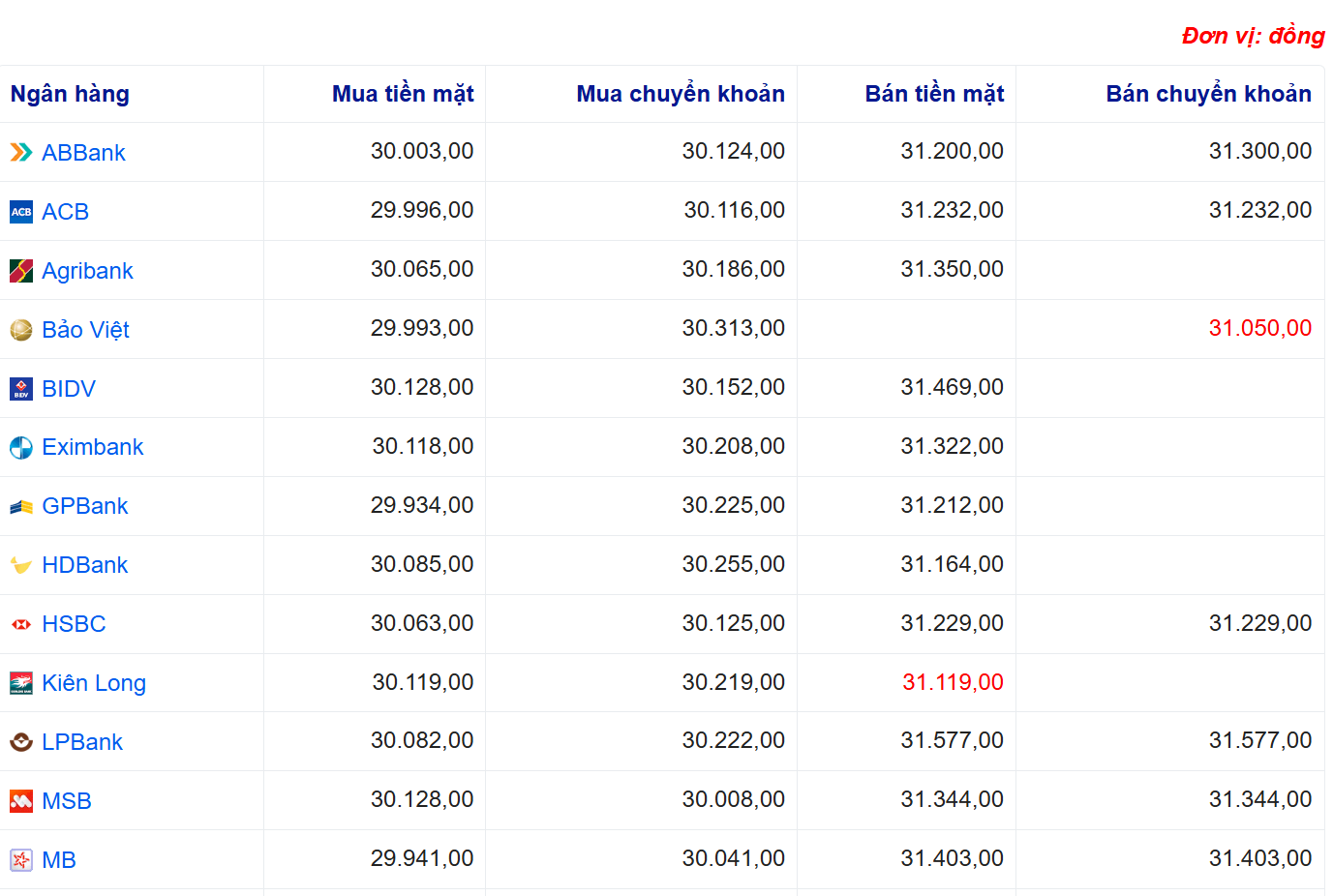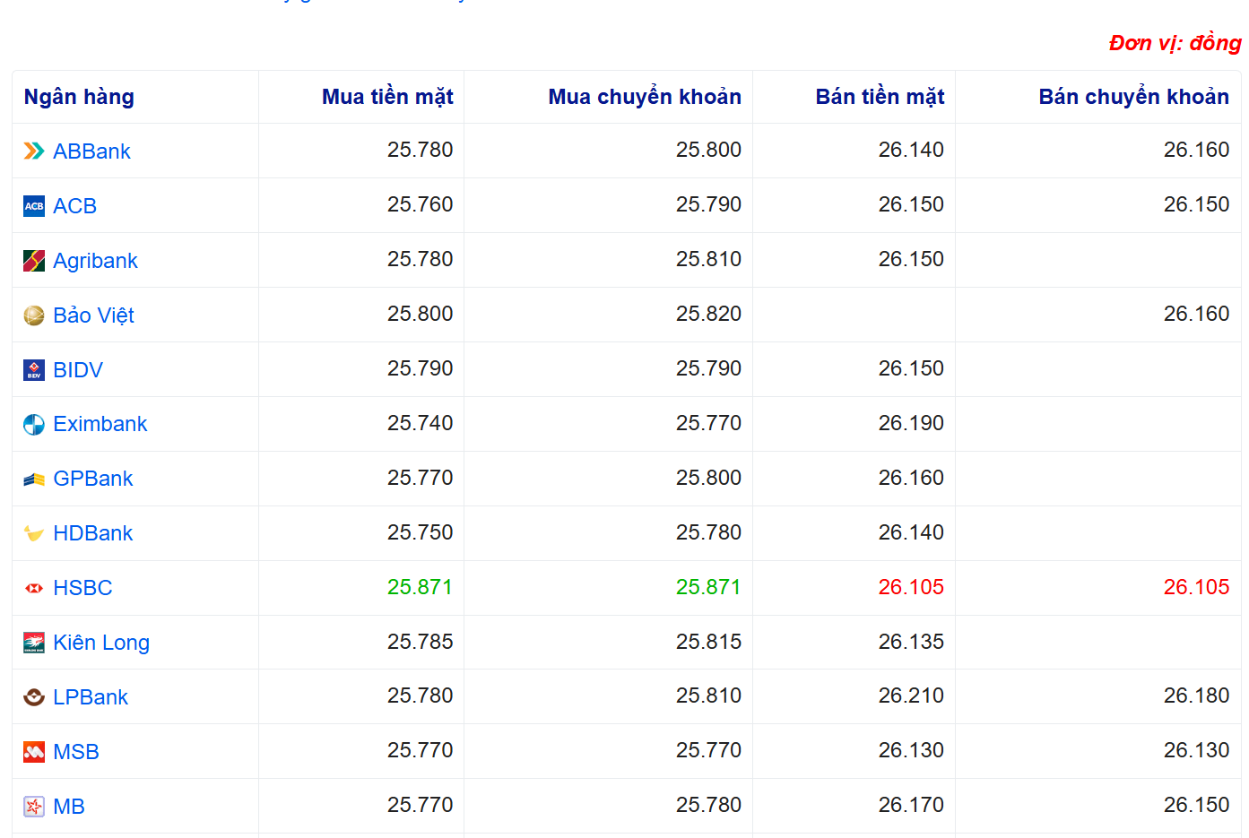 Tỷ giá USD tại một số ngân hàng: