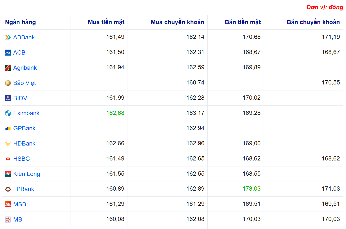 Tỷ giá yên Nhật tại một số ngân hàng: