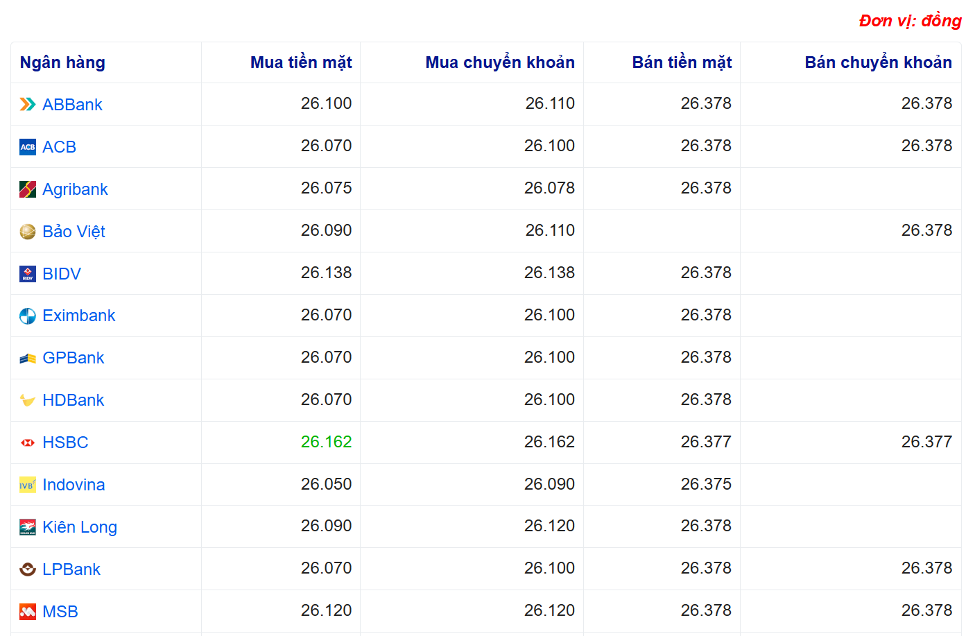 Ở thị trường trong nước, Ngân hàng Nhà nước công bố tỷ giá trung tâm giữa đồng Việt Nam và USD giảm 2 đồng so với phiên trước, xuống còn 25.122 đồng/USD. Tại Sở giao dịch Ngân hàng Nhà nước được niêm yết ở mức 23.916 đồng/USD ở chiều mua vào và 26.328 đồng/USD ở chiều bán ra. Tại các ngân hàng thương mại lớn, tỷ giá USD nhìn chung ổn định, với giá mua vào dao động quanh ngưỡng 25.900–26.100 đồng/USD và giá bán ra phổ biến ở mức 26.378 đồng/USD.