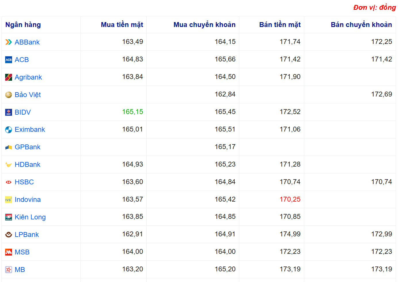 Tỷ giá yên Nhật tại một số ngân hàng: