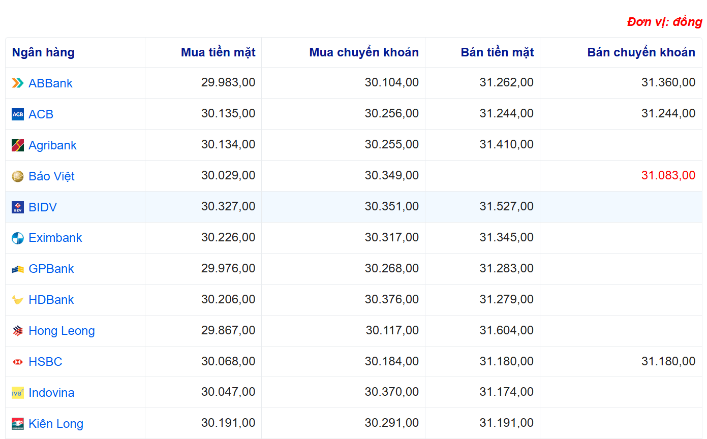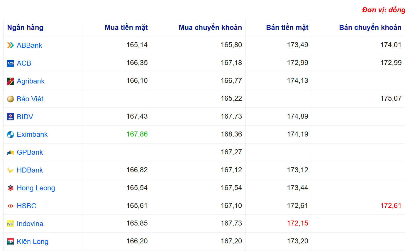 Tỷ giá yên Nhật tại một số ngân hàng: