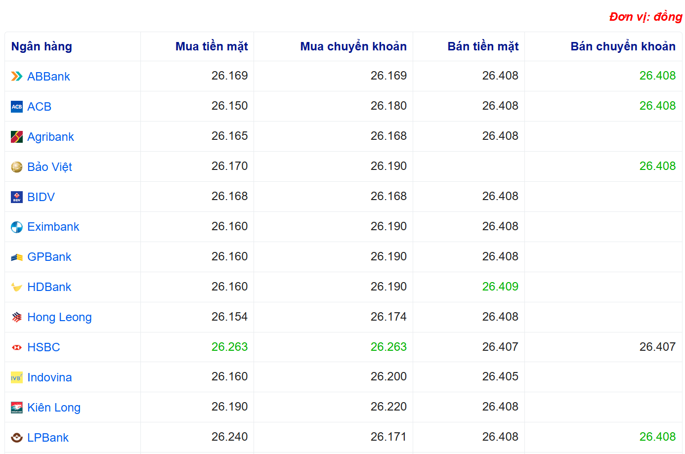 Tại các ngân hàng thương mại, giá USD hầu như không biến động khi Vietcombank niêm yết 26.138 - 26.408 đồng, VietinBank giao dịch 26.000 - 26.408 đồng và BIDV giữ mức 26.168 - 26.408 đồng/USD.