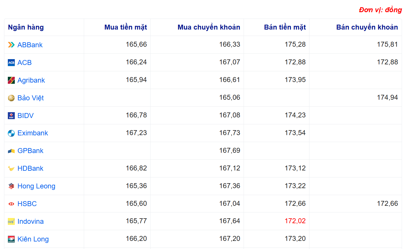 Tỷ giá yên Nhật tại một số ngân hàng: