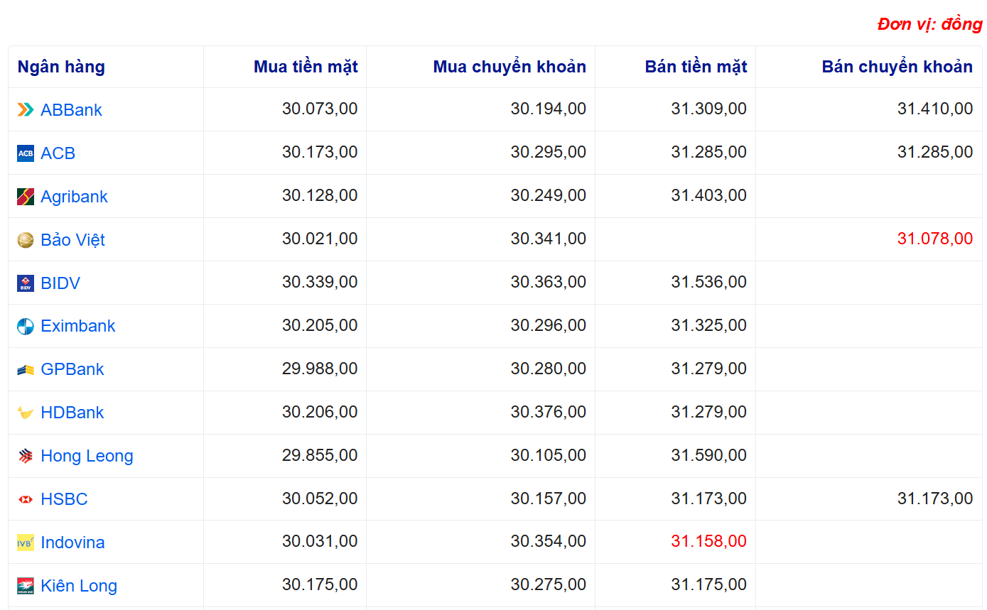 Tỷ giá USD tại một số ngân hàng: