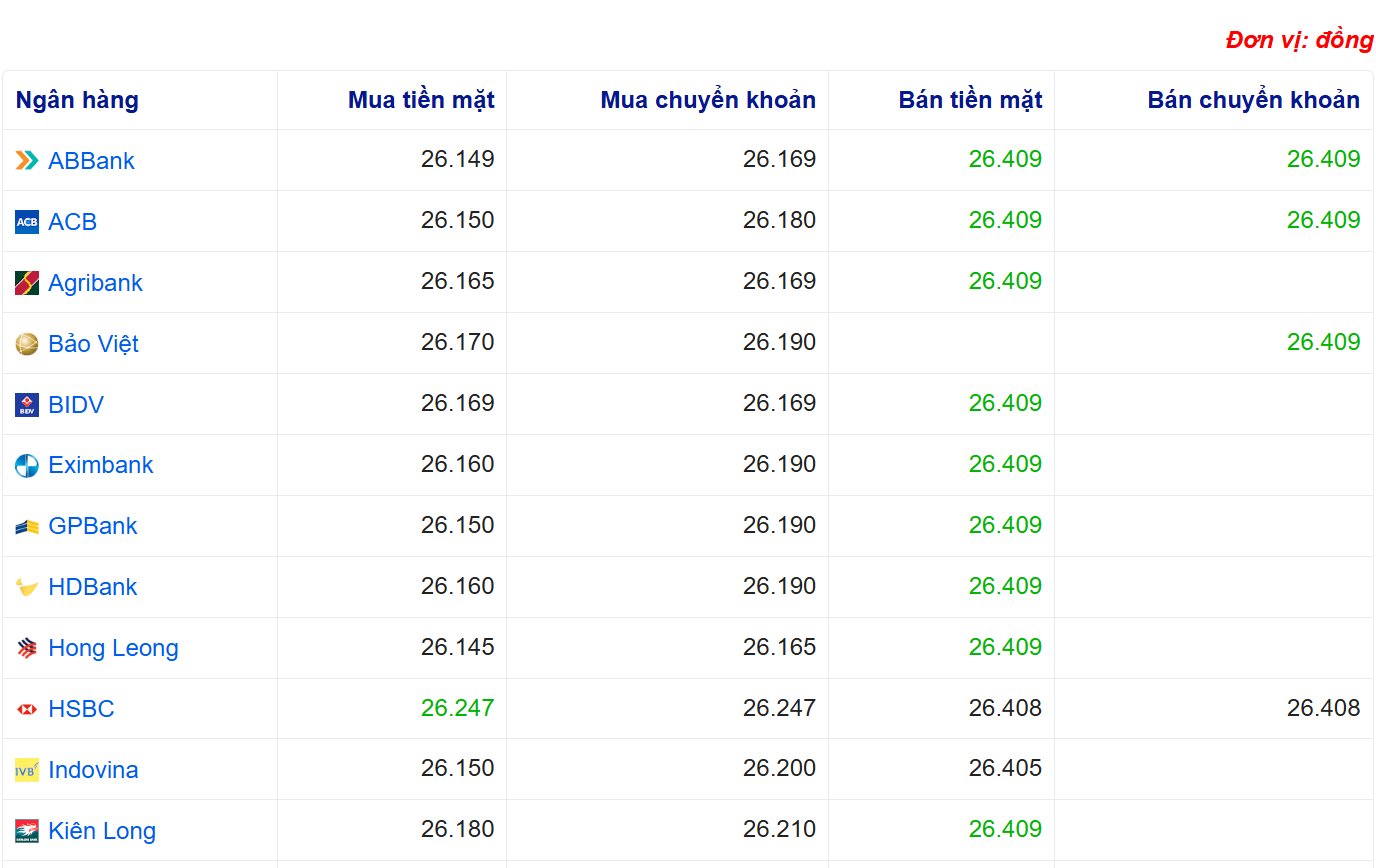 Trên thị trường ngân hàng, giá USD tiếp tục ổn định khi Vietcombank giao dịch ở mức 26.139 - 26.409 đồng, VietinBank ở mức 26.000 - 26.409 đồng và BIDV ở mức 26.169 - 26.409 đồng/USD.