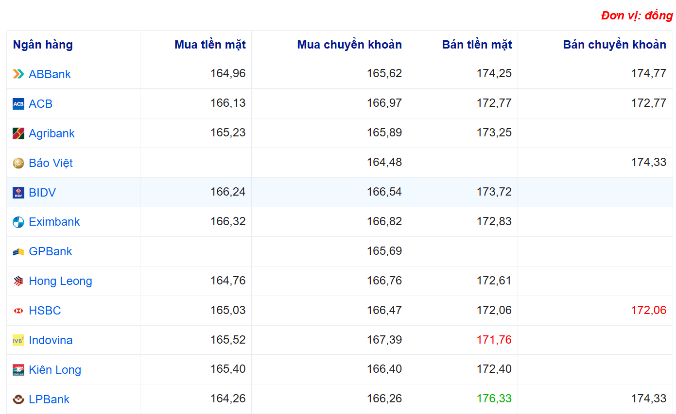 Ngược lại, tỷ giá yên Nhật giữ nguyên ở mức 153 đồng mua vào và 169 đồng bán ra trong cả hai ngày liên tiếp.