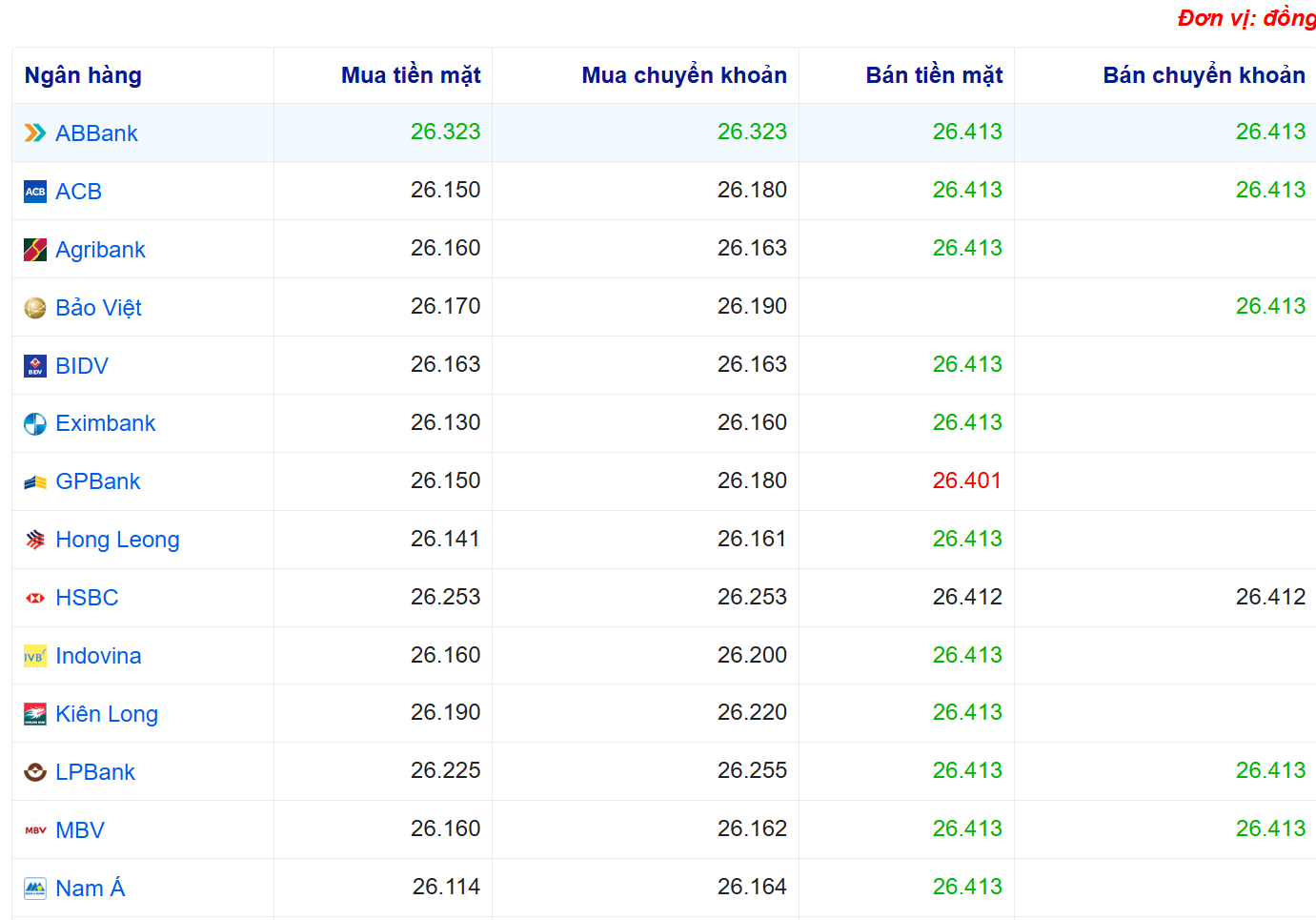 Ở khối ngân hàng thương mại, Vietcombank niêm yết USD ở mức 26.133 - 26.413 đồng, còn VietinBank giao dịch ở mức 26.010 – 26.413 đồng trong sáng 2/12, phản ánh diễn biến đi ngang so với ngày 1/12.