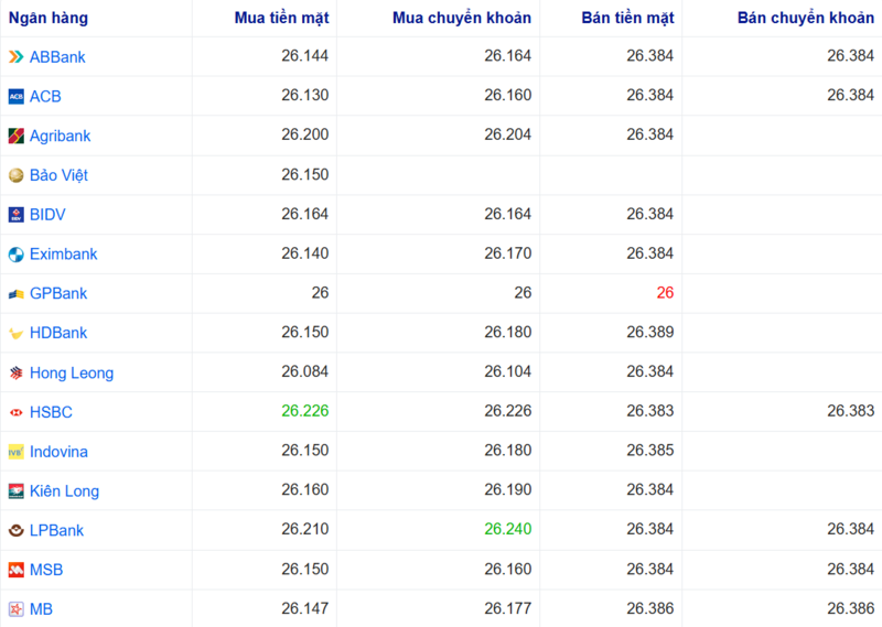 Ngân hàng GPBank đang mua chuyển khoản Đô la Mỹ với giá thấp nhất là: 1 USD = 26 VND