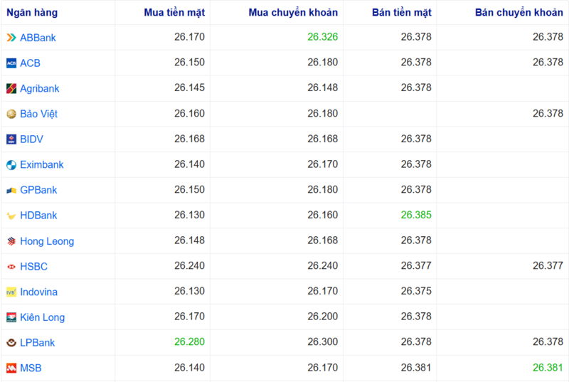 Ngân hàng ABBank đang mua chuyển khoản Đô la Mỹ với giá cao nhất là: 1 USD = 26.326 VND