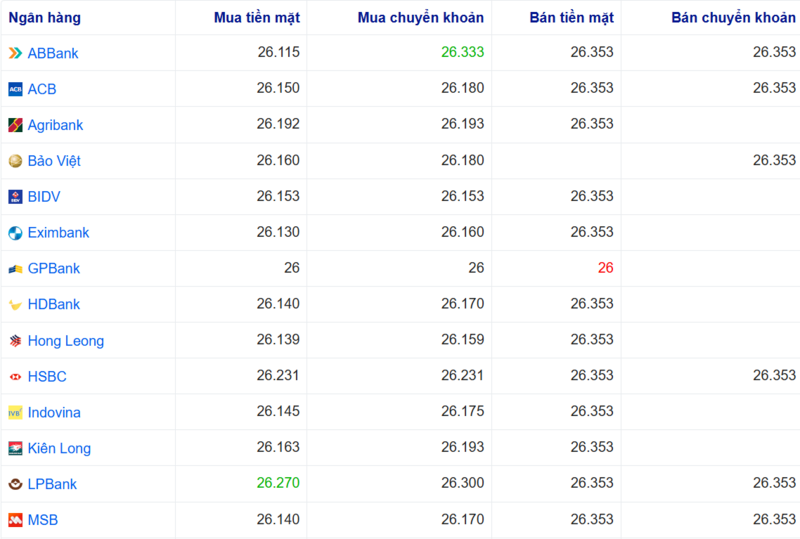 Ngân hàng ABBank đang mua chuyển khoản Đô la Mỹ với giá cao nhất là: 1 USD = 26.333 VND