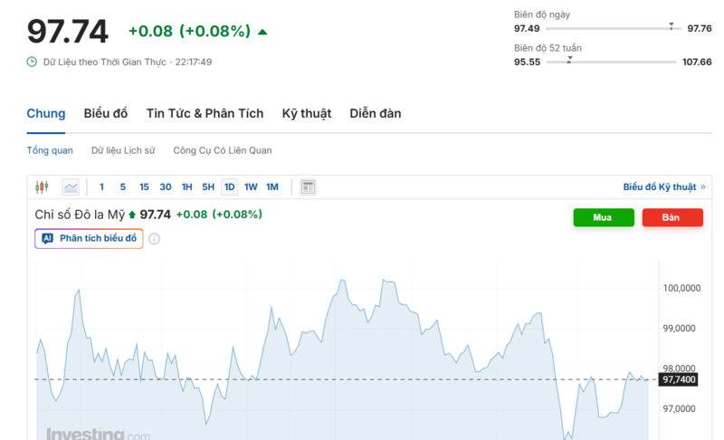 Chỉ số Dollar Index (DXY), đo lường đồng USD với 6 đồng tiền chủ chốt (EUR, JPY, GBP, CAD, SEK, CHF), đã dừng ở mức 97,74 điểm, tăng 0.08% so với chốt phiên lần trước.