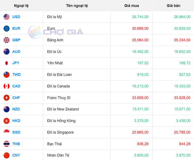 Cụ thể, tại Ngân hàng Vietcombank, tỷ giá USD hiện ở mức 25.997 - 26.307 đồng/USD, tăng 23 đồng ở cả chiều mua và 3 đồng ở chiều bán so với phiên giao dịch trước đó.