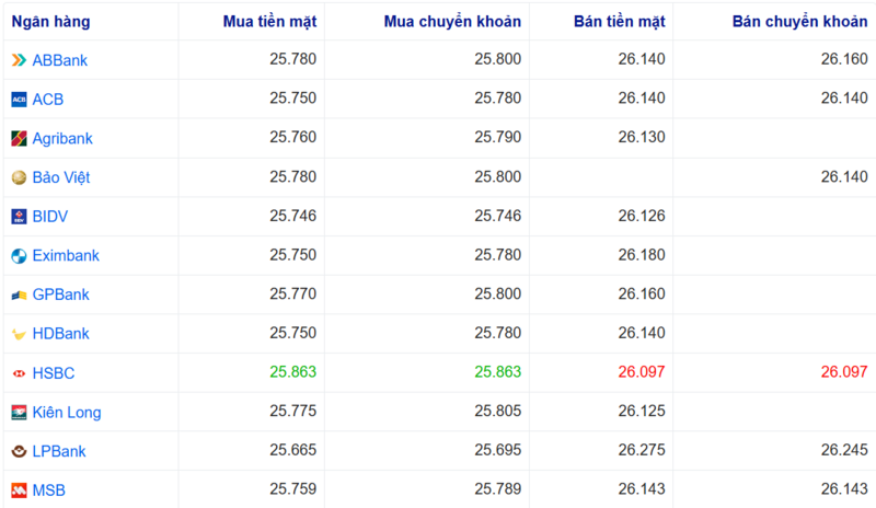 Ngân hàng HSBC đang bán chuyển khoản Đô la Mỹ với giá thấp nhất là: 1 USD = 26.097 VND