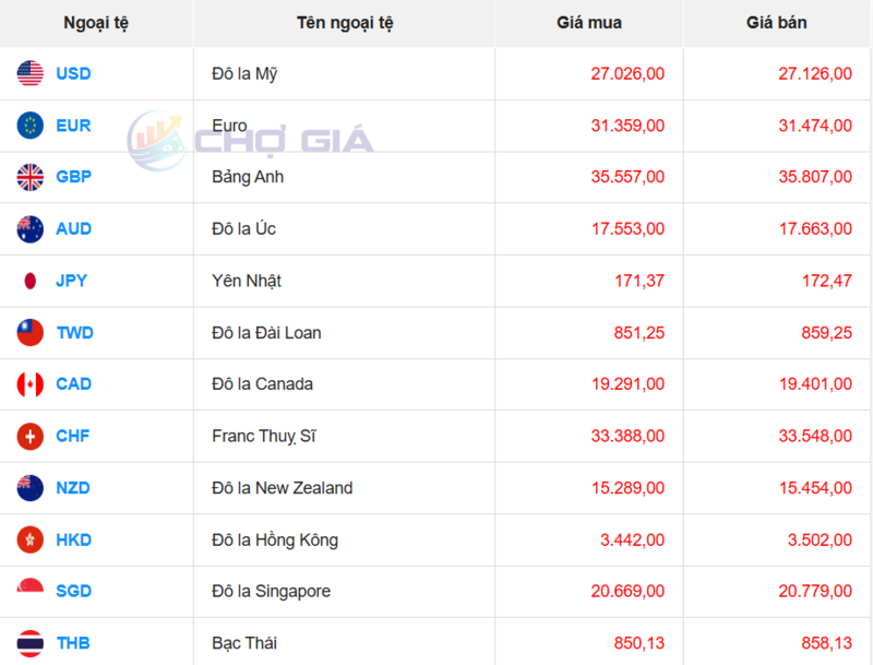 Cụ thể, tại Ngân hàng Vietcombank, tỷ giá USD hiện ở mức 26.093 - 26.403 đồng/USD, tăng 5 đồng ở chiều mua và 2 đồng ở chiều bán so với phiên giao dịch trước đó.