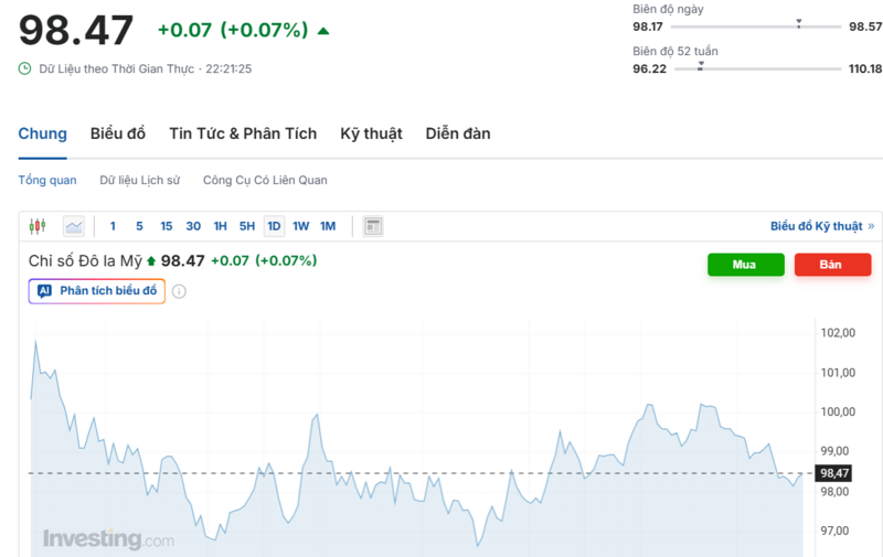 Chỉ số Dollar Index (DXY), đo lường đồng USD với 6 đồng tiền chủ chốt (EUR, JPY, GBP, CAD, SEK, CHF), đã dừng ở mức 98.47 điểm, tăng 0.07% so với chốt phiên lần trước.
