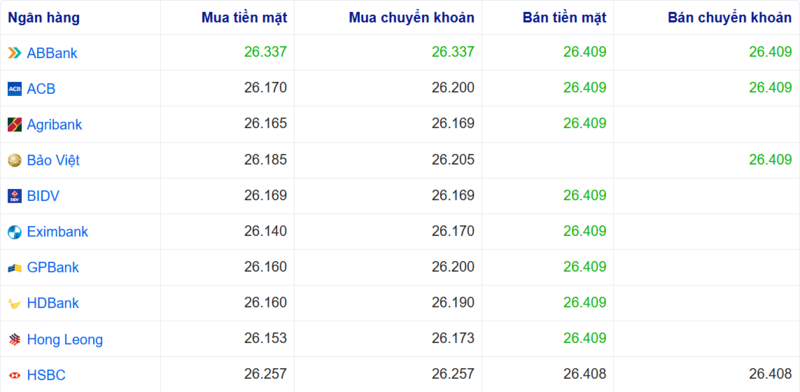 Ngân hàng VietBank, VPBank đang bán chuyển khoản Đô la Mỹ với giá cao nhất là: 1 USD = 26.409 VND