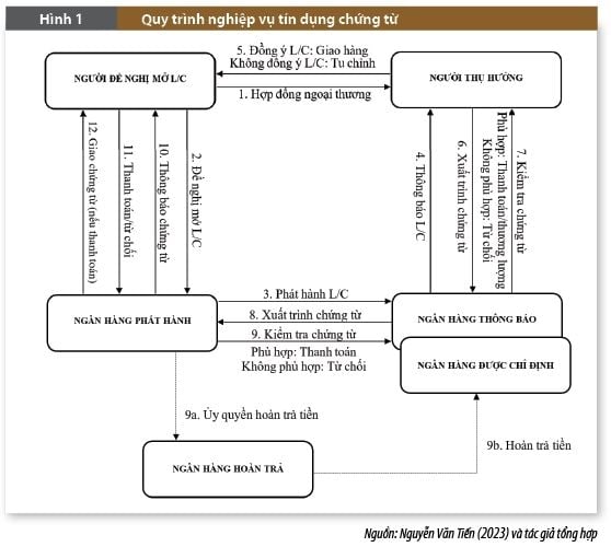 Tùy theo trường hợp áp dụng, cam kết thanh toán của ngân hàng phát hành L/C có thể được thể hiện dưới hai hình thức: (i) L/C thương mại (Commercial L/C), phát hành trên cơ sở một giao dịch thương mại và (ii) L/C dự phòng (Standby L/C), trong đó ngân hàng cam kết thanh toán cho người thụ hưởng nếu người yêu cầu mở L/C vi phạm nghĩa vụ hợp đồng. Trong thực tế, L/C thương mại được sử dụng phổ biến hơn, do đó bài viết tập trung vào nghiệp vụ L/C thương mại trong hoạt động ngân hàng. Theo đó, người đề nghị mở L/C là nhà nhập khẩu và người thụ hưởng L/C là nhà xuất khẩu. Quy trình tổng quát của nghiệp vụ tín dụng chứng từ được minh họa trong Hình 1.