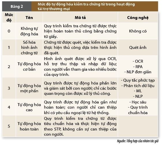 Trong nghiệp vụ L/C, hoạt động kiểm tra chứng từ đóng vai trò then chốt vì sự phù hợp của chứng từ là cơ sở để ngân hàng quyết định việc thanh toán hoặc thương lượng. Tự động hóa quy trình kiểm tra chứng từ hiện là mục tiêu mà nhiều ngân hàng hướng đến nhằm giảm thiểu sai sót và nâng cao hiệu quả xử lý. Theo khung phân loại của ICC (2021), mức độ tự động hóa kiểm tra chứng từ được chia thành 6 cấp độ (Bảng 2). Hiện nay, nhiều ngân hàng nước ngoài đạt cấp độ 2 - 3 (tự động hóa cơ bản đến một phần), tùy theo mức độ triển khai cụ thể của từng ngân hàng. Trong khi đó, các ngân hàng Việt Nam mới chỉ đạt cấp độ 1, tức mới dừng ở giai đoạn số hóa hình ảnh chứng từ.