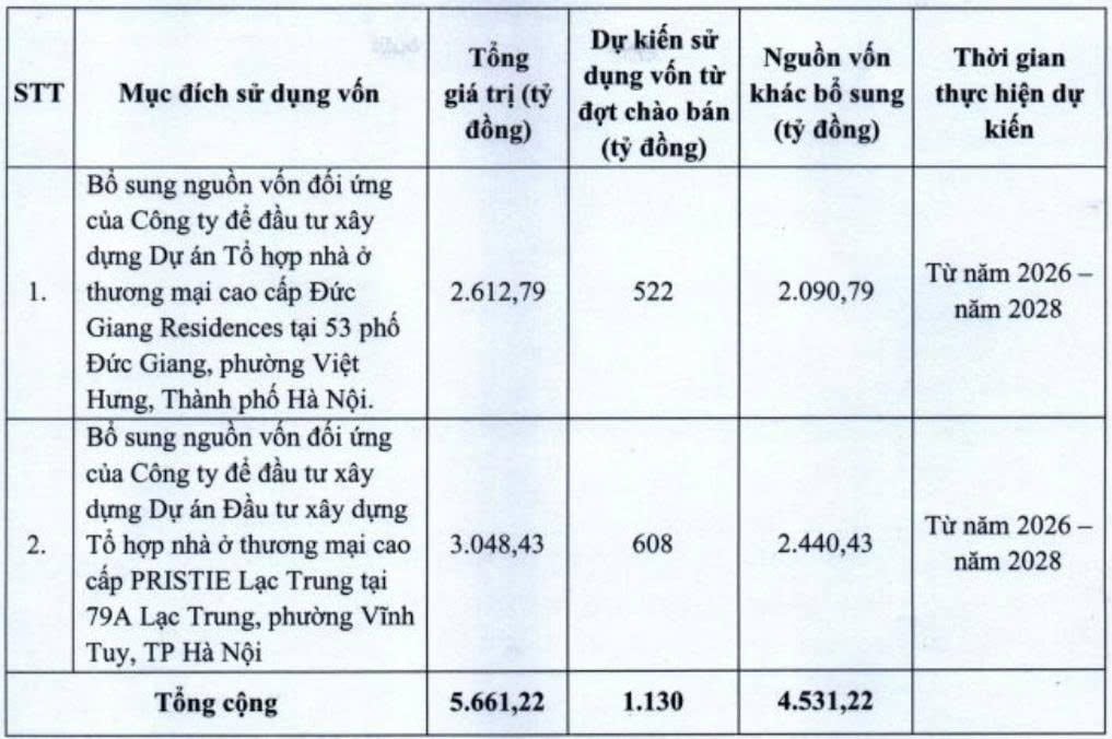 Nguồn vốn này sẽ được doanh nghiệp sử dụng để bổ sung vốn đối ứng cho các dự án đầu tư phát triển bất động sản, cụ thể là hai dự án nhà ở thương mại cao cấp tại Hà Nội. Thời gian triển khai dự kiến trong giai đoạn từ năm 2026 đến năm 2028.