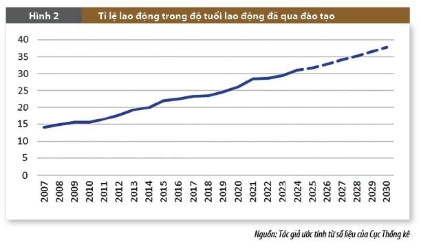 Theo kịch bản khả quan nhất, trong giai đoạn 2025 - 2030, lực lượng lao động của Việt Nam chỉ tăng bình quân khoảng 0,61%/năm. Trong khi đó, tỉ lệ thất nghiệp duy trì ở mức thấp, khoảng 2,1 - 2,4%, cho thấy dư địa huy động thêm lao động để phục vụ tăng trưởng cao là khá hạn chế trong 5 năm tới. Đồng thời, việc nâng cao chất lượng nguồn nhân lực cũng diễn ra chậm. Đến năm 2024, tỉ lệ lao động trong độ tuổi đã qua đào tạo mới đạt khoảng 31%. Với tốc độ cải thiện hiện nay, đến năm 2030 tỉ lệ này được ước tính chỉ đạt khoảng 37,8%, đồng nghĩa với việc hơn 62% lao động chưa qua đào tạo. (Hình 2)