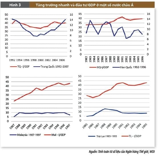 Trong giai đoạn 1992 - 2007, Trung Quốc đạt mức tăng trưởng bình quân 10,5%/năm với tỉ lệ đầu tư/GDP thường xuyên trên 35%, và vượt 40% kể từ sau năm 2003. Hàn Quốc trong giai đoạn 1982 - 1996 cũng đạt tốc độ tăng trưởng bình quân 9,77%/năm, đồng thời liên tục thúc đẩy tỉ lệ đầu tư/GDP tăng dần từ 32,8% lên đến 40% vào năm 1996. Xu hướng tương tự cũng được quan sát tại Malaysia trong gia đoạn 1987 - 1997 và tại Thái Lan giai đoạn 1985 - 1995, với tốc độ tăng trưởng bình quân lần lượt đạt 9,27% và 9,25%/năm; trong cả hai trường hợp đều cho thấy, Malaysia và Thái Lan đã đẩy mạnh tỉ lệ đầu tư/GDP và vượt 40% vào nửa cuối giai đoạn tăng trưởng cao (Hình 3). Tính trung bình, tỉ trọng đầu tư so với GDP trong các giai đoạn tăng trưởng nhanh của bốn nền kinh tế này dao động trong khoảng 38,07% (Malaysia) đến 38,46% (Trung Quốc), cho thấy vai trò then chốt của tích lũy vốn đối với tăng trưởng cao và bền vững.