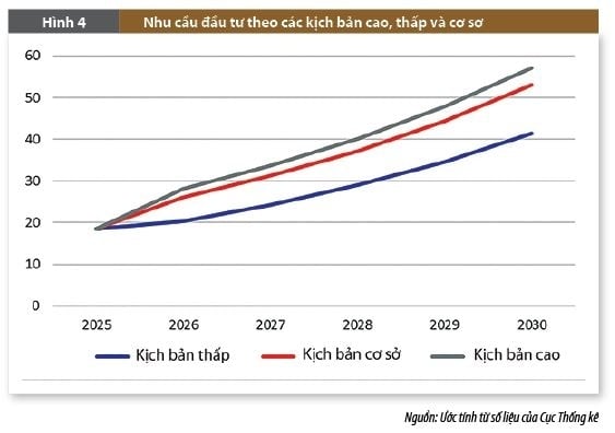 Với ba kịch bản trên, tổng vốn đầu tư toàn xã hội được ước tính tăng từ khoảng 3,52 triệu tỉ đồng năm 2024 lên đến 7,6 triệu tỉ đồng vào năm 2030 theo kịch bản thấp, 9,5 triệu tỉ đồng theo kịch bản cao và khoảng 9,0 triệu tỉ đồng theo kịch bản cơ sở. (Hình 4)