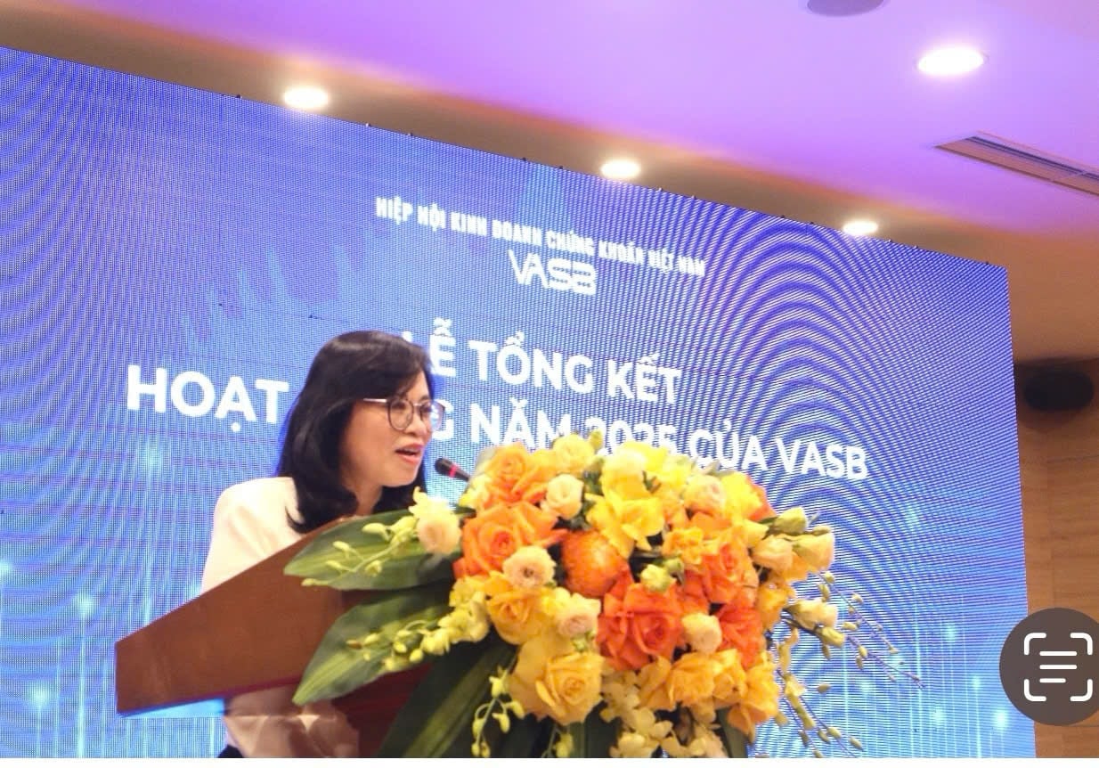 Báo cáo tại buổi lễ, bà Hoàng Hải Anh – Phó Chủ tịch, Tổng Thư ký VASB nhấn mạnh, năm 2025 là một dấu mốc quan trọng khi kinh tế Việt Nam tăng trưởng mạnh mẽ, thị trường chứng khoán bùng nổ cả về quy mô lẫn chất lượng, tạo nền tảng cho những bước phát triển dài hạn.