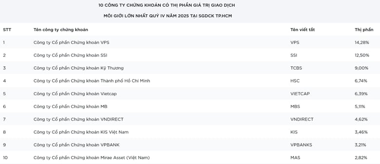 Quý IV/2025, CTCP Chứng khoán VPBank (VPBankS; HoSE: VPX) đã lần đầu lọt top 10 đơn vị có thị phần giá trị giao dịch môi giới cao nhất trên Sở Giao dịch Chứng khoán TP Hồ Chí Minh (HoSE), ở vị trí thứ 9, chiếm 3,21%. Công ty cũng vươn lên top 6 về thị phần trên Sở Giao dịch Chứng khoán Hà Nội (HNX), đạt 4,75%, cải thiện 4 bậc so với quý liền trước và tiếp tục nằm trong top 10 về thị phần môi giới UPCoM và thị trường giao dịch chứng khoán phái sinh.
