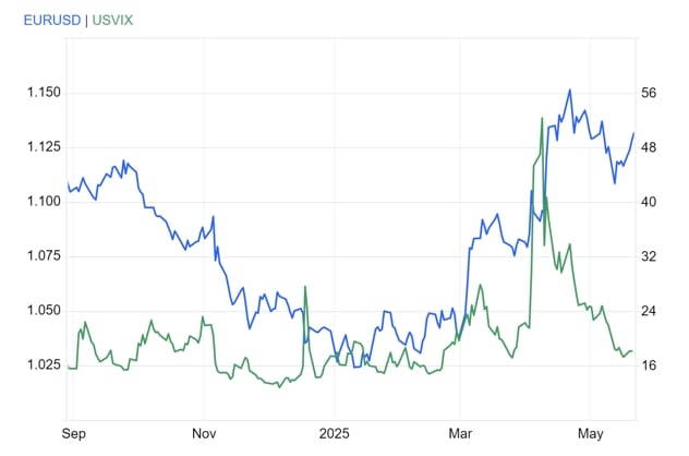 Biểu đồ 1: Tỉ giá EUR/USD và chỉ số VIX