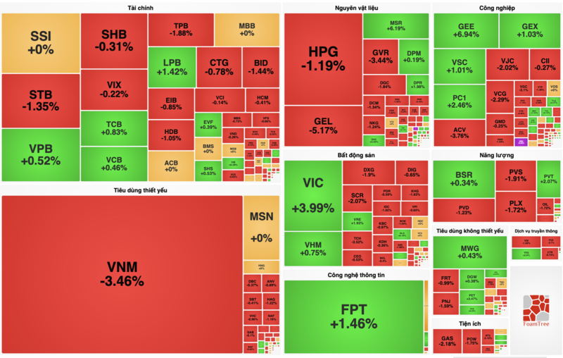 Tổng thể, dù số mã giảm nhỉnh hơn số mã tăng, VN-Index vẫn duy trì được mức tăng nhờ lực đỡ từ một vài cổ phiếu đầu tàu, đặc biệt là VIC. Diễn biến này cho thấy chỉ số đang phụ thuộc khá nhiều vào các trụ lớn, trong khi phần còn lại của thị trường vẫn trong trạng thái thăm dò và phân hóa.