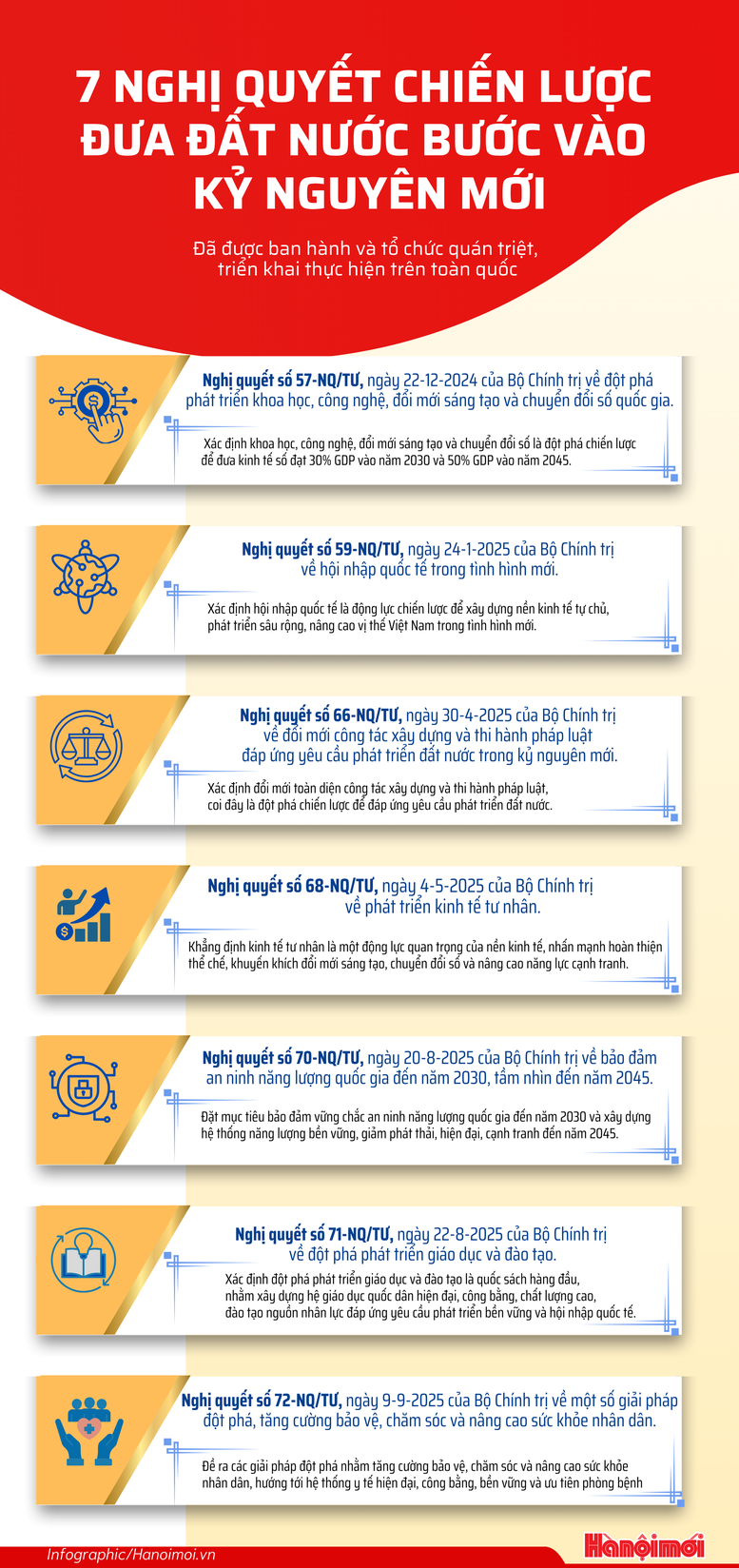 margin: 15px auto;" />Cuối năm 2024 và trong năm 2025, Bộ Chính trị đã ban hành nhiều nghị quyết mang tính đột phá về đường lối, thể chế, chính sách, tạo nền tảng vững chắc để đất nước sẵn sàng bước vào kỷ nguyên mới: (1) Đột phá phát triển khoa học, công nghệ, đổi mới sáng tạo và chuyển đổi số quốc gia (số 57-NQ/TW ngày 22/12/2024); (2) Hội nhập quốc tế (số 59-NQ/TW ngày 24/1/2025); (3) Đổi mới công tác xây dựng và thi hành pháp luật đáp ứng yêu cầu phát triển đất nước trong kỷ nguyên mới (số 66-NQ/TW ngày 30/4/2025); (4) Phát triển kinh tế tư nhân (số 68-NQ/TW ngày 4/5/2025); (5) Bảo đảm an ninh năng lượng quốc gia đến năm 2030, tầm nhìn đến năm 2045 (số 70-NQ/TW ngày 20/8/2025); (6) Đột phá phát triển giáo dục và đào tạo (số 71-NQ/TW ngày 22/8/2025); (7) Một số giải pháp đột phá, tăng cường bảo vệ, chăm sóc và nâng cao sức khỏe Nhân dân (số 72-NQ/TW ngày 09/9/2025). Cùng với đó, chuẩn bị ban hành các nghị quyết về kinh tế nhà nước, kinh tế có vốn đầu tư nước ngoài và về văn hóa.