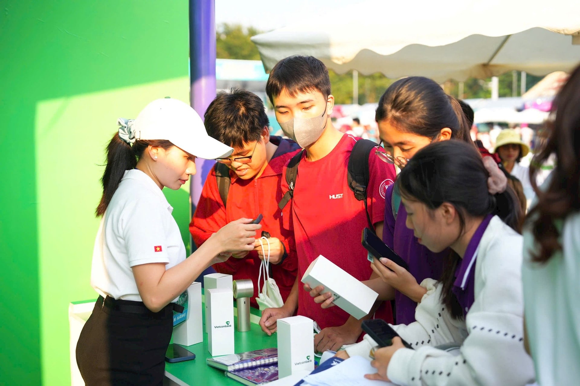 Gian hàng Vietcombank với chủ đề “V-Station: Trạm Số – Chạm Chill” thu hút đông đảo các bạn trẻ, sinh viên và các tín đồ công nghệ trực tiếp chạm – trải nghiệm loạt giải pháp số hiện đại như: